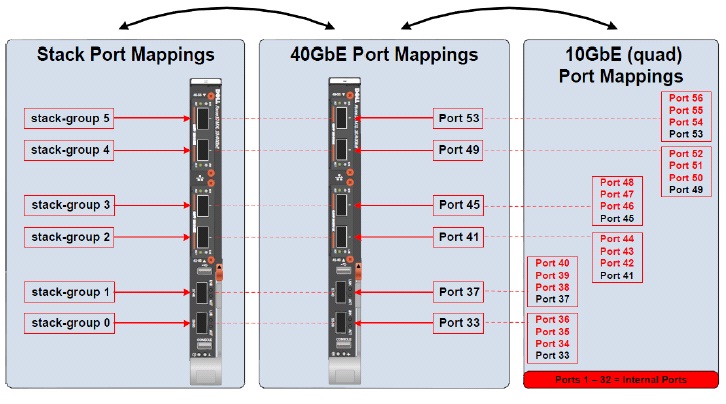 By default, the 40GbE ports on a 2-Port 40GbE QSFP+ module come up in 4x10GbE (quad) mode as eight 10GbE ports.For the external ports, it is worthwhile remembering that the numbering starts from the bottom, and assumes 2 port QSFP+ module in each slot (for numbering only). Since each QSFP/40G port can be split into 4 x 10G ports (via splitter cables), each port is thus assigned a numbering block of 4.