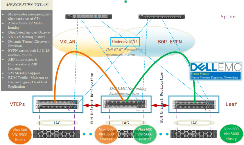 - Active-Active multi-homing at Layer 2: VLT/MLAG/VLAG pairs for dual homing of network endpoints, at the leaf. Both VLT/MC-LAG peer switches would act as a single logical VTEP, and participate in the BGP-EVPN operations as Active Forwarders.
