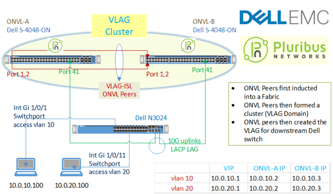 Nevertheless, the building blocks remain the same as in this basic setup. The result was an ONVL fabric with the two switches in a multi-chassis LAG (Pluribus parlance – VLAG), VRRP and vRouters. To these was connected, a single Dell EMC edge switch with active active LAG links.