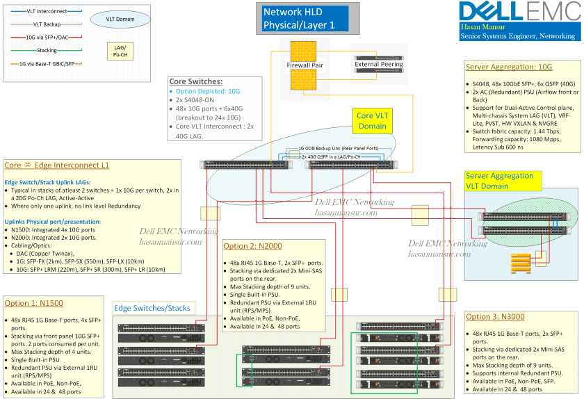 The following is a sample HLD which captures an S-Series 10G Core & Server Aggregation, and options for 1G at Access/User Edge via N-Series. Do note the depicted options are only a subset of those available. there are other switches in the range, and I do intend to cover the different options for campus edge in more detail in the next post.