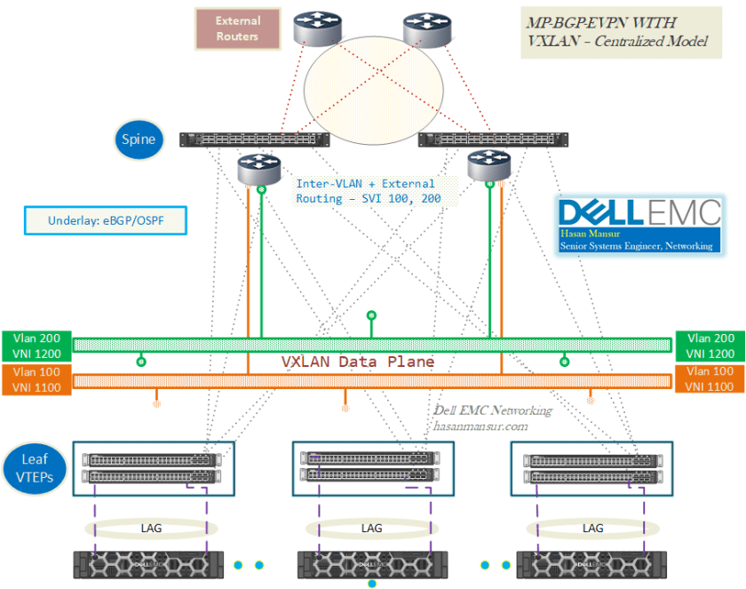 - The spine switch learns external routes, and advertises them into the EVPN domain as EVPN routes, so that other leaf VTEPs can learn/use them for sending outbound traffic.